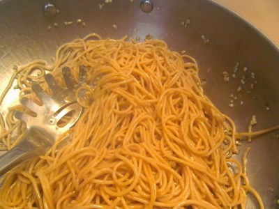 I get a lot of my love for cooking from my mother. She was always creating tasty and exciting ways to get me to eat vegetables; she would sneak shredded zucchini and squash into spaghetti sauce. Almost every Friday she would cook up here spaghetti in a huge batch and it would last the whole week! It was usually served with carrot sticks with ranch dip and garlic toast. We would eat it for breakfast, lunch, and dinner! Her spaghetti is one of my absolute favorite meals even to this day! I had always associated tomato sauce with spaghetti and spaghetti with tomato sauce. That is how it was. That was spaghetti. I recently was referred to a recipe that claimed to be the traditional way spaghetti was prepared, except it did not use a tomato base for the sauce! Furthermore, there was not even really a sauce on it! It turned out to be extremely satisfying and light! If you need to avoid tomatoes or have frequent heart burn, try this type of spaghetti!