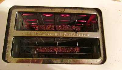Start to toast sliced french baguette in a toaster oven and add a basil pesto halfway through. Once the toast is crispy, remove from the oven and let sit until the soup comes to a boil.