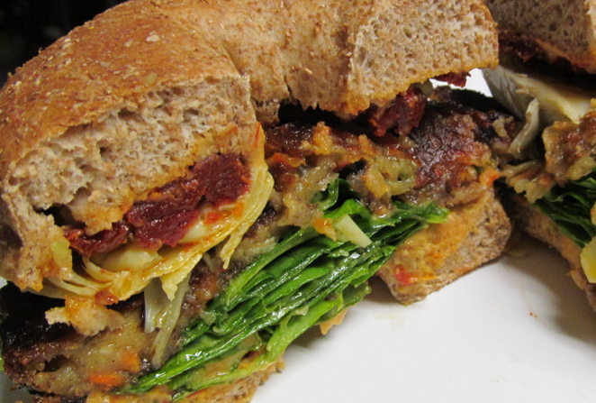 Heat enough olive oil to coat the pan on medium heat for two minutes, then fry both sides of the patty until crispy. While the burger is frying, spread hummus on both sides of the bagel. Top the hummus with spinach, artichoke hearts, and sun-dried tomatoes. Allow patty to cool for 1-2 minutes. Place patty on top of vegetable mix, then cover with the second half of the bagel. Enjoy!