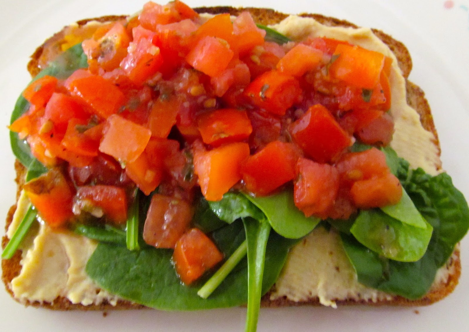 Toast the bread until lightly brown. Spread the hummus on the bread. Top with baby spinach leaves and the bruschetta topping and devour like a wild herbivore. The bruschetta mix I used was store bought, containing tomatoes, onions, garlic and basil.