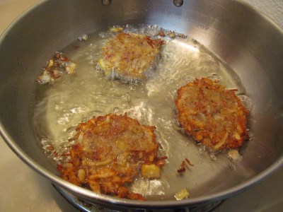 Heat the oil on medium and when it is hot, fry the balls for 5 minutes, turning occasionally. For a crispier shell, fry for about 7 minutes, or until dark brown. Be careful of the small breadcrumb debris that will fall off. If this stays in the oil for too long it will burn and start smoking and the fire alarm will go off and a fire truck will come and you will have to say it was a false alarm and you will be embarrassed and dinner will be delayed and everything will be cold.