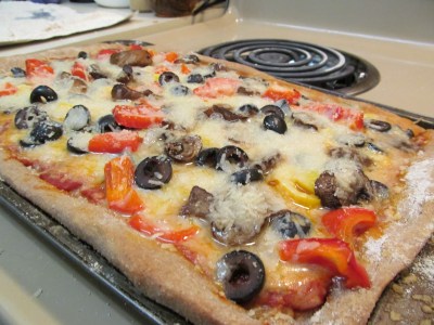Pre-heat the oven to 450°F. Lay out some flour in a thin layer. Roll the uncooked pizza dough around in the flour to coat all of the outside surface. Flatten and spread the dough out. Coat the bottom of a baking tray with a drizzle of extra virgin olive oil. Place the dough on the tray, spreading it to all the edges. Spread the pizza sauce evenly over the dough. Sprinkle a light layer of cheese over the sauce. Add the veggie toppings evenly. Cover the veggies with the rest of the cheese. Place the vezza in the oven for at least 30 minutes. Soy cheese takes longer to melt than dairy cheese. Remove the vezza when the crust is golden brown and the cheese is melted. Let cool 10 minutes before slicing and serving.  Eat up!
